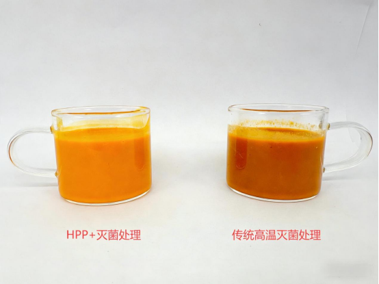 采用HPP+工艺制作的沙棘原浆,与传统产品相比,有着天壤之别。其色泽鲜亮通透,如同现榨鲜果;口感醇厚顺滑,满口都是沙棘的天然风味;更重要的是,沙棘中的维C、黄酮、多酚等营养成分几乎未受破坏,得以完整保留。检测数据显示,HPP+工艺下,维C的保留率近乎100%,远高于传统工艺。此外,HPP+工艺还彻底打破了沙棘果的细胞壁,使得营养更易被人体吸收。